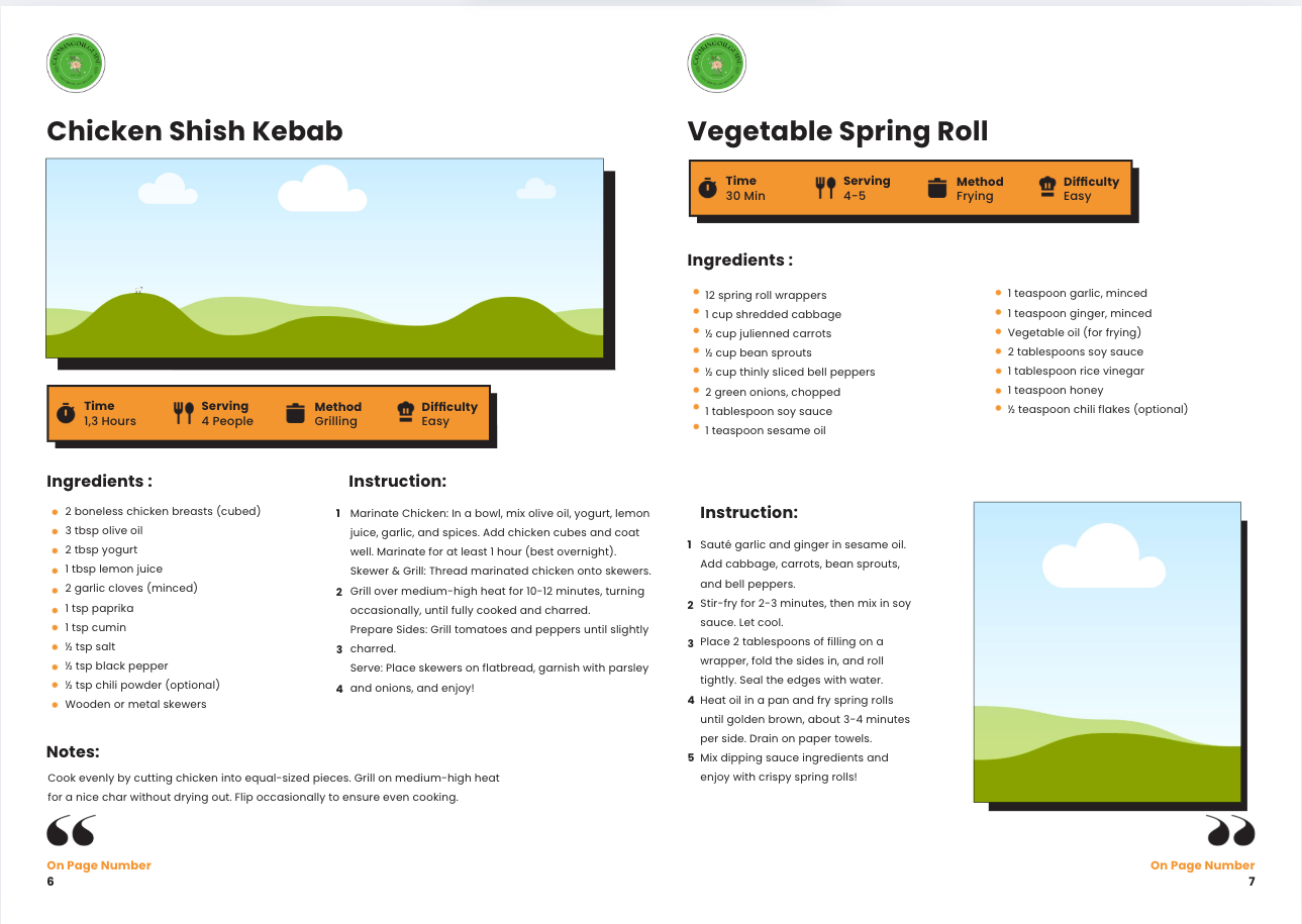 - Versatile 16-page layout in A4 format (with 3 mm bleed) — includes customizable recipe pages, photography spreads, ingredient lists, and more.